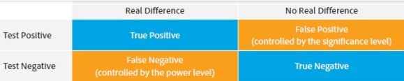 - False Positive Rates are 5%: this means that 5% of the time when the treatment and control are no different, we will incorrectly conclude from the experiment they are different.